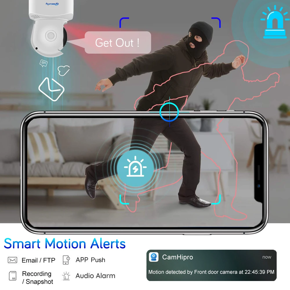 Есть ли кто-нибудь у вашей задней двери? Мой дом в безопасности, пока я не дома? Камеры ZYsecurity решат эти проблемы! С функцией обнаружения движения и сигнализации FTP/Email, оповещения о сообщениях в реальном времени будут отправлены на ваш телефон. Как только Вы активируете функцию обнаружения движения, камера безопасности автоматически снимет и записывает видео.