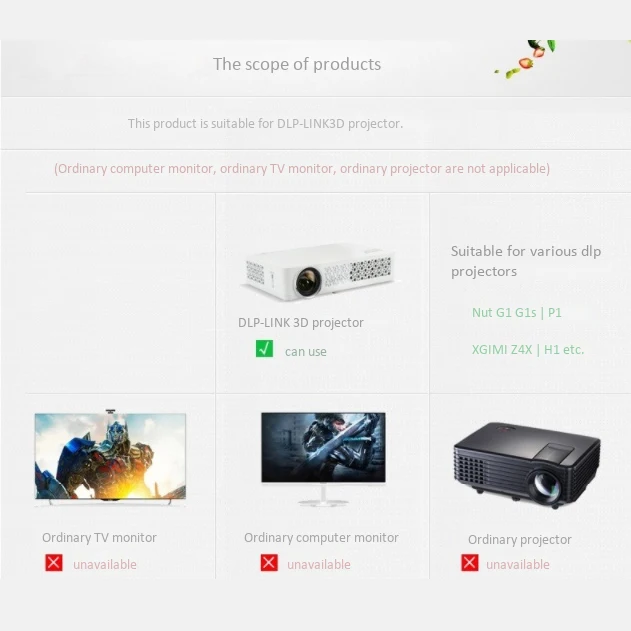 4. Применимые модели: подходят для Aurora, Jmgo, Sony, BenQ, Epson, Panasonic, Acer, Hitachi, Sharp и многих других dlp-проекторов (только 3D)