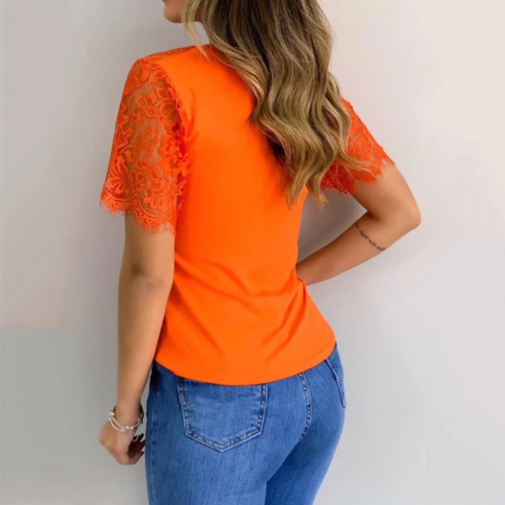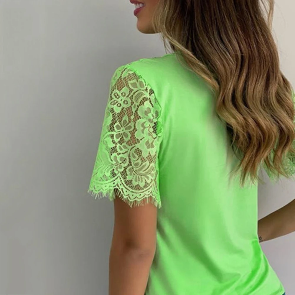 Женская сексуальная летняя кружевная Лоскутная футболка с коротким рукавом и V-образным вырезом