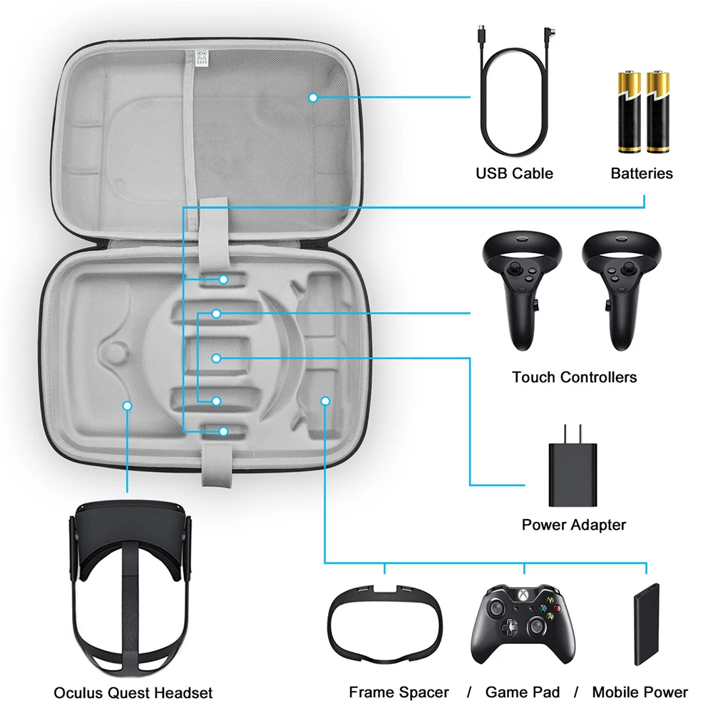 Портативный VRИгровая гарнитура сенсорные контроллеры сумка для хранения большой емкостиЧехол для путешествийOculus Quest VRАксессуары Описание: LИзготовлен из высококачественного кожаного материала, водонепроницаемый и прочный LВнутренняя часть сумки изготовлена из высококачественной ЭВА и фланели премиум-класса для защиты от воздействия шлема LУниверсальная молния обеспечивает безопасность устройства. Легкий доступ к вашему устройству с открыванием и закрытием молнии LРегулируемый плечевой ремень с металлической пряжкой обеспечивает удобство в обращении и переноски Чехол LЗащищает VR от случайных ударов, царапин и падений во время использования чехол. LКонструкция большой емкости позволяет хранить не только игровые гарнитуры и сенсорные контроллеры, но и такие аксессуары, как игровые банки питания, кабели для зарядки и адаптеры. LХороший аксессуар для путешествий и мероприятий на свежем воздухе Спецификация: LМатериал: ЭВА, кожа LЦвет: черный LРазмер: прибл. 34x23x11,5 см (13.38x9.05x4.52in) LПодходит для: Oculus Quest VR Посылка: L1x сумка для хранения L1x металлическая пряжка регулируемый плечевой ремень L1x Защитный чехол для объектива L1x ремень для зарядного кабеля Примечание: LТолько вышеуказанная посылка, другие демонстрационные аксессуары на картинке не включены! LСветильник и различные дисплеи могут привести к тому, что цвет товара на картинке немного отличается от реального. LДопускается погрешность в измерениях +/- 1-3 см.