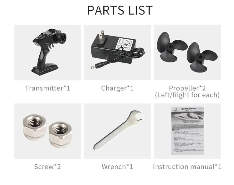 Пульт дистанционного управления Корабль * 1 пульт дистанционного управления * 1 зарядное устройство * 1 пропеллер * 2 Шестигранная гайка * 1 гаечный ключ с открытым зевом * 1 руководство по эксплуатации * 1