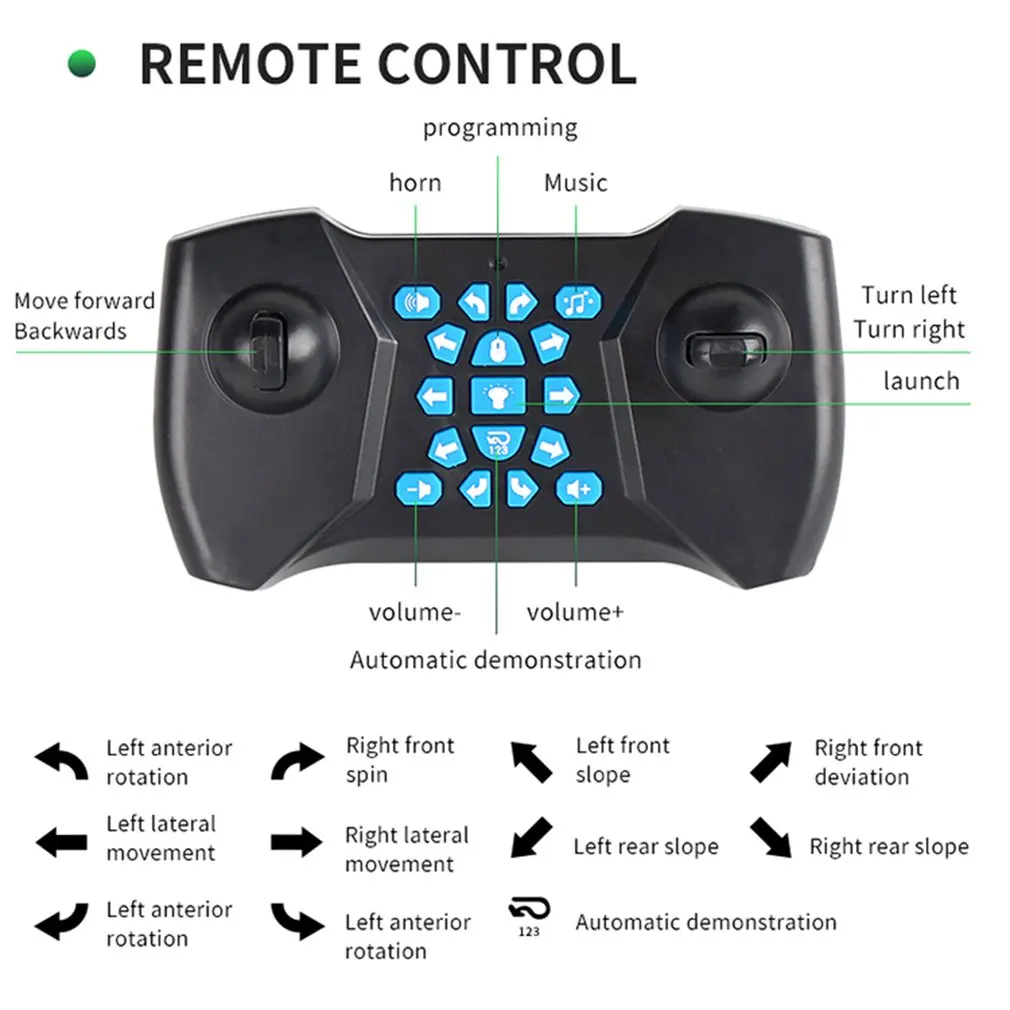 6. Функции: вперед, назад, поворот влево, поворот вправо, влево в сторону, вправо в сторону, дрейф, крутые огни, танцевальная музыка, звуковые эффекты динамика, программирование, запуск водяных бомб.