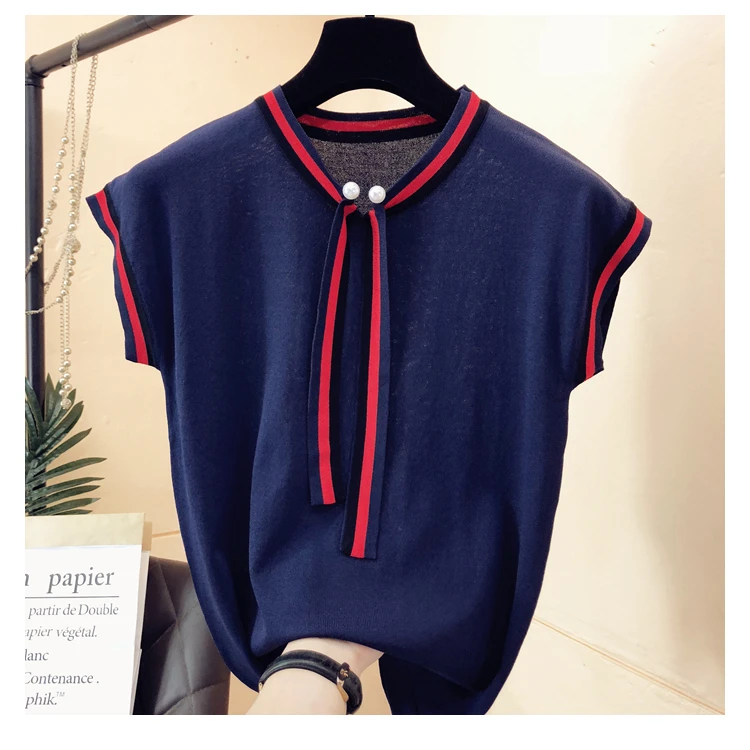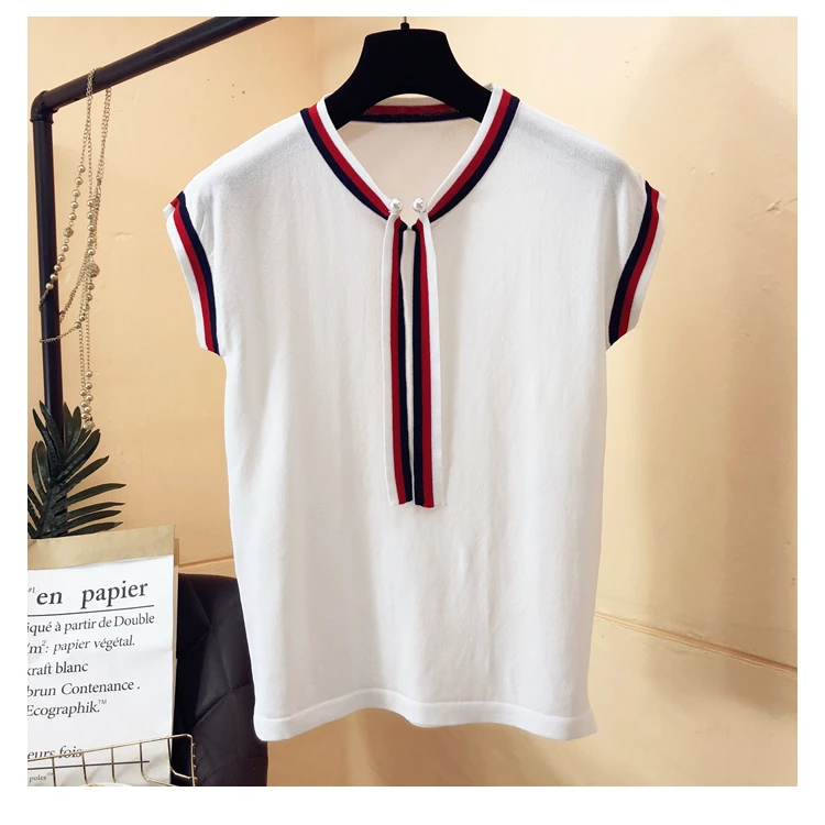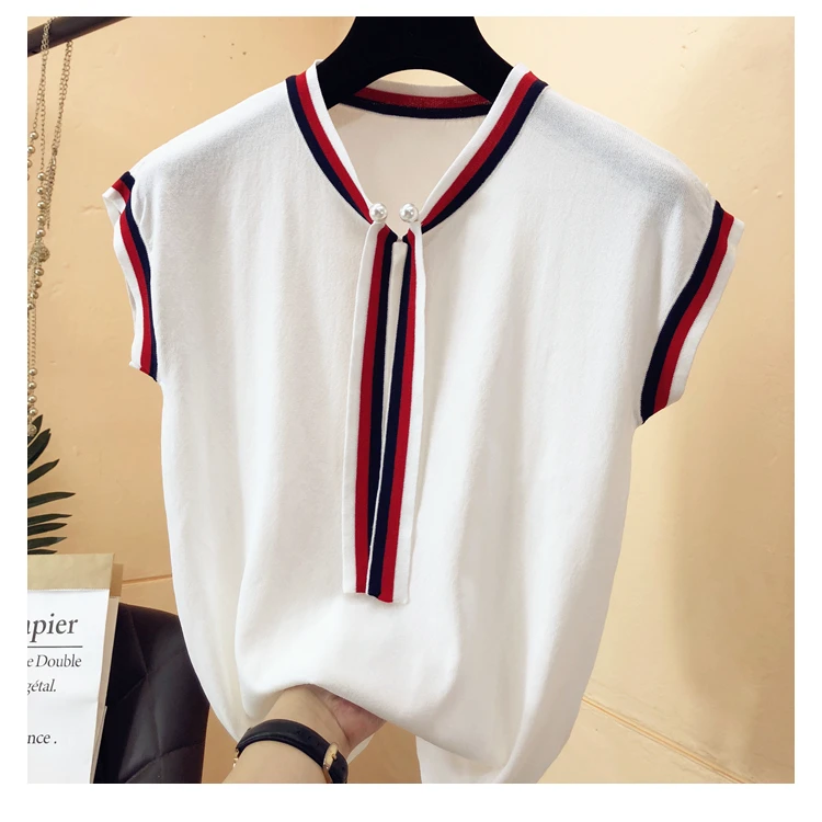 Женский трикотажный свитер с лентами из шелка ледяного цвета, корейский пуловер с круглым вырезом и бусинами, белые летние топы с коротким рукавом, весна 2022