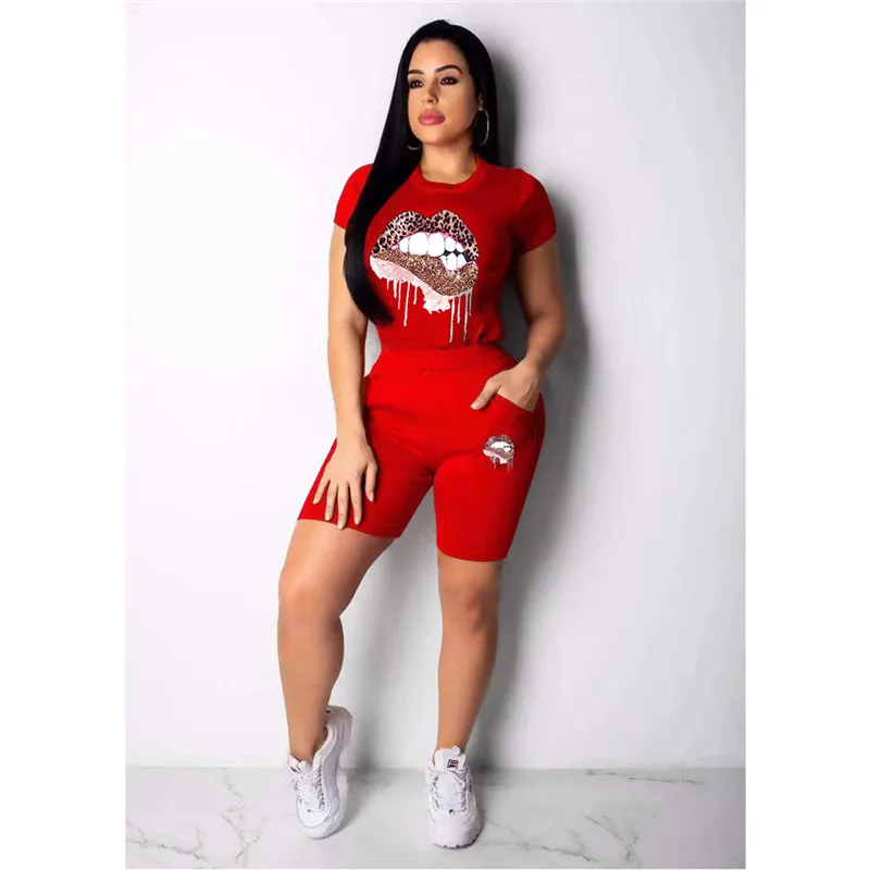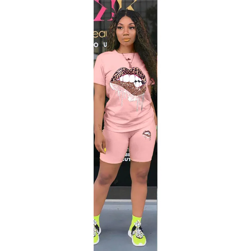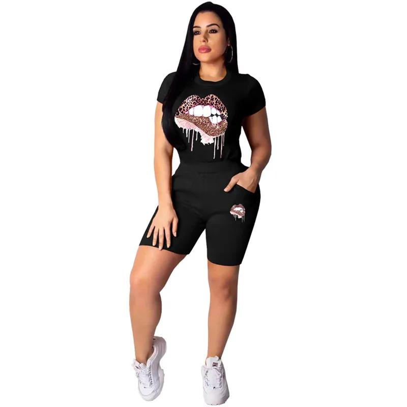 2 Pieces Women Casual Outfit Crew Neck Short Sleeve Exaggerated Lips Print Pullover T-shirt Top+ Elastic Waist Shorts Streetwear