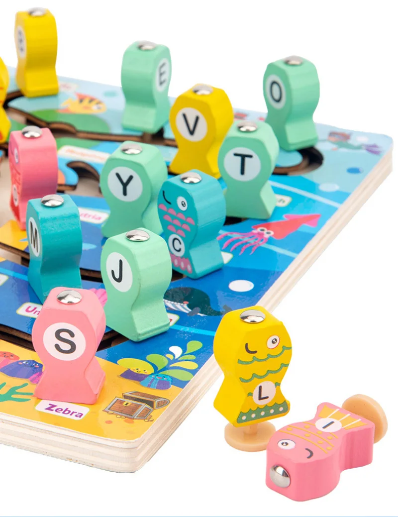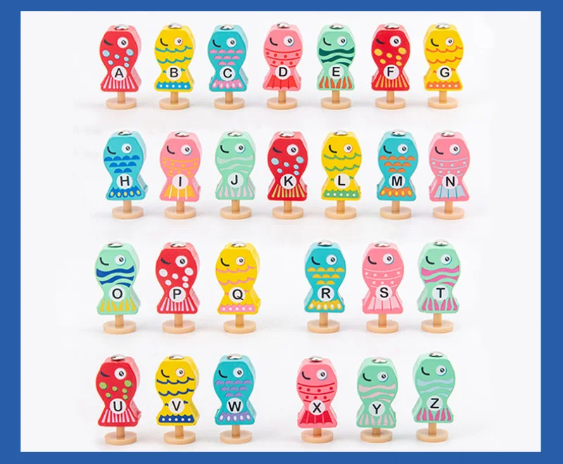 Маленькая рыба, которую нужно перемещать, будет всасываться магнитом на удочке, и маленькая рыба будет поймана обратно в соответствующую буквенную позицию