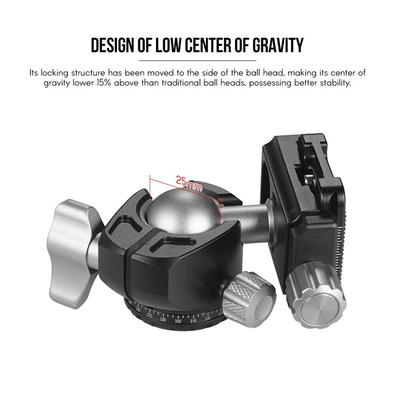 Конструкция низкого центра тяжести: его фиксирующая структура была перемещена на сторону шаровой головки, что делает ее центр тяжести ниже 15% выше, чем традиционные Шаровые Головки, обладая лучшей стабильностью. Дизайн с двойной зазубриной: имеет двойной u-образный дизайн и имеет мощную силу блокировки, Которые эффективно улучшают манипуляцию различными устройствами. Может быстро переключаться между вертикальной съемкой и горизонтальной съемкой.