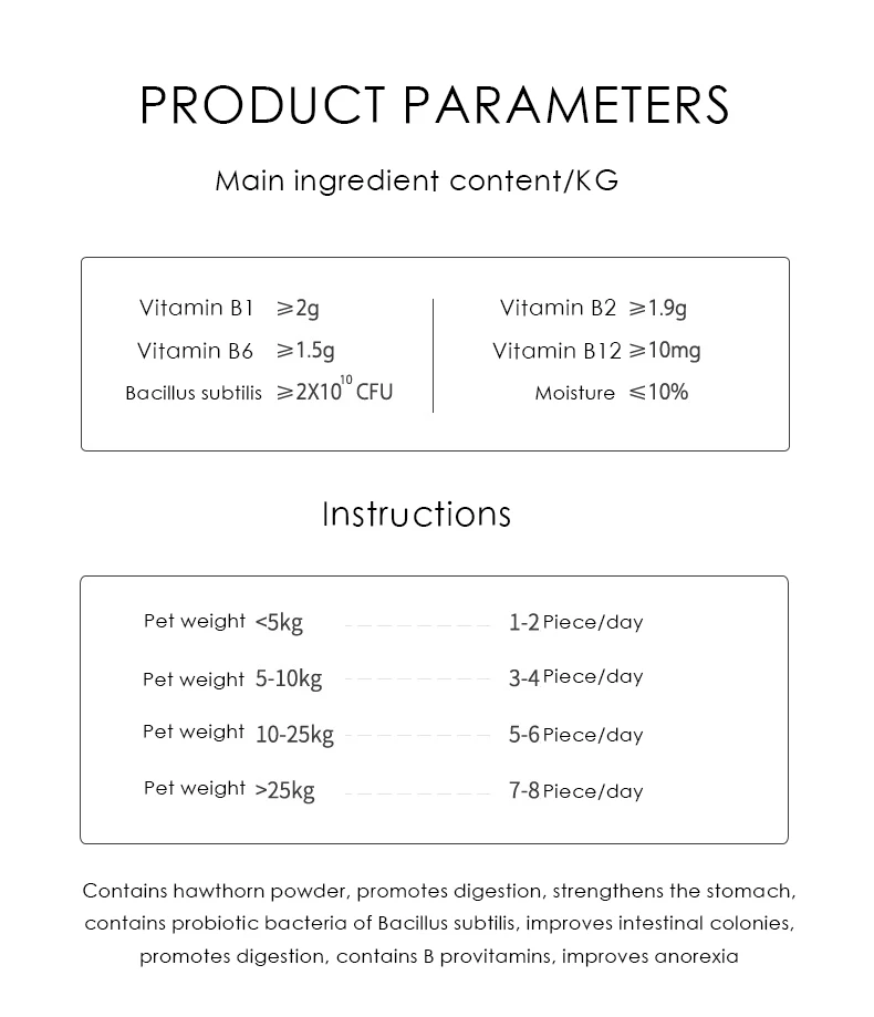 Витаминированный разнообразными питательными веществами, требуемыми домашними животными, он может повысить секрецию слюнных слюнов, поддерживая желудочно-кишечный тракт и помогая пищеварению