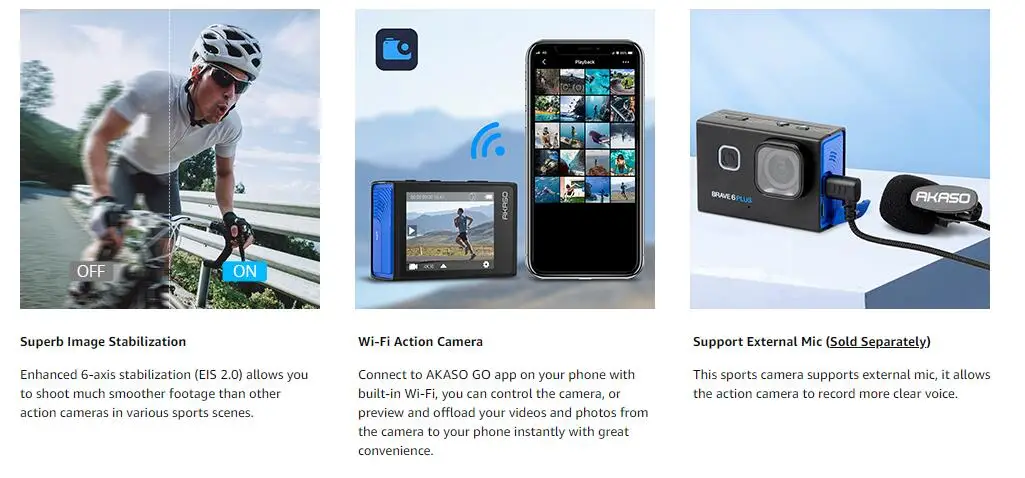 Спецификация: 2 "сенсорный экран/Голосовое управление/электронная стабилизация изображения 2,0/8x зум/регулируемый угол обзора/дистанционное управление/Wi-Fi/фото Burst/Автоспуск/Время отключения видео/режим дайвинга/спецэффекты/Баланс белого/Циклическая запись/режим вождения/WDR/аудио запись/USB-C Джек Теплые советы: Samsung 64 Гб 100 МБ/с./с (U3) MicroSDXC Evo выберите карту памяти настоятельно рекомендуется для экшн-камеры AKASO Brave 6 Plus 4K (карта MicroSD НЕ входит в комплект). Перед использованием отформатируйте карту в камере. Что в коробке: 1 Экшн-камера AKASO Brave 6 Plus/1 пульт дистанционного управления 2,4G/2 аккумулятора 1350 мАч/1 водонепроницаемый чехол/1 велосипедная подставка/7x крепление/2x зажим/1 Крепление на шлем/1 повязка/5x трос/1x защитная задняя дверь/1x USB кабель
