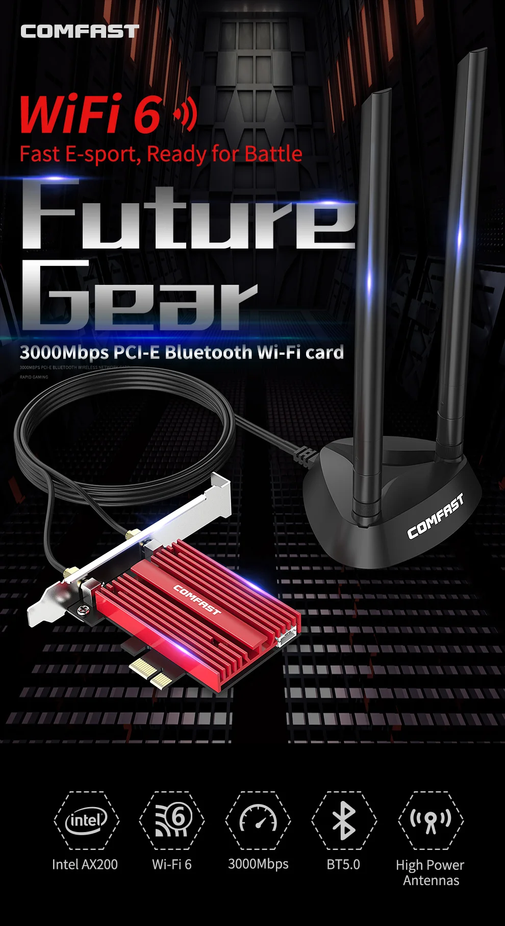 Wi-Fi 6 TechnologyThe latest Wi-Fi 6 standard gives you incredible speed, ultra-low latency, and uninterrupted connectivity. Utilizing next-generation Wi-Fi 6, CF-AX200 is designed to excel in even the busiest of networks. Next-Gen Speeds up to 2.4 GbpsLet your PC experience speeds faster than Wi-Fi 5 (AC) with 1024-QAM and a 160 MHz bandwidth that delivers powerful, continuous WiFi to keep your PC running at top speed. Minimized Lag for Your PCRevolutionary OFDMA reduces lag you can enjoy ultra-responsive real-time gaming or an immersive VR experience.Supports Windows 10 (64-bit) only. Better Efficiency on Busy NetworksGet the most efficient WiFi connection for your PC with MU-MIMO technology, which lets your adapter communicate with your router along with other devices without lag. Bluetooth 5.0 for Greater Speeds and CoverageCF-AX200 is equipped with the latest Bluetooth 5.0 Technology, achieving 2x faster speeds and 4x broader coverage than Bluetooth 4.2. Connect all your devices, including game controllers, headphones, and keyboards, for the ultimate setup. Advanced EncryptionBrowse safely knowing that your high-speed WiFi is protected from hackers and malware via advanced WPA3 encryption. Package included:1*CF-AX2001*Screw1*Bluetooth Cable1*CD1*Warranty Card![]()